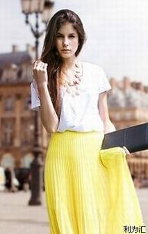 最佳搭配榜上一定有白色T恤+雪纺长裙,休闲舒适的白色T恤,搭配上同样舒适的雪纺裙,柠檬黄的夏天想不减龄都不行。
