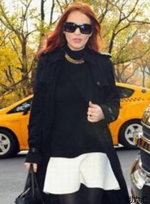 浪漫的酒红色长卷发,黑超墨镜,身上黑色超长大衣披开,搭配黑色高领毛衣,用金色项链做点缀,下身白色短裤和打底裤,黑白色的经典撞色,时尚潮流。