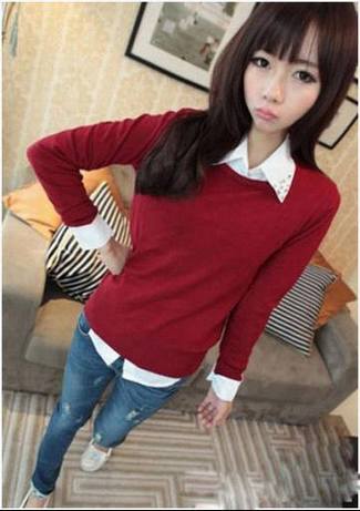 女生最爱冬装款毛衣,完美穿搭衬衫十足减龄。搭配酒红色的打底毛衣,简约的风格透露出女生的柔美和细腻,内搭白色的衬衫,两种简单的服饰相搭配,可以打造出一种简约而又减龄的味道。