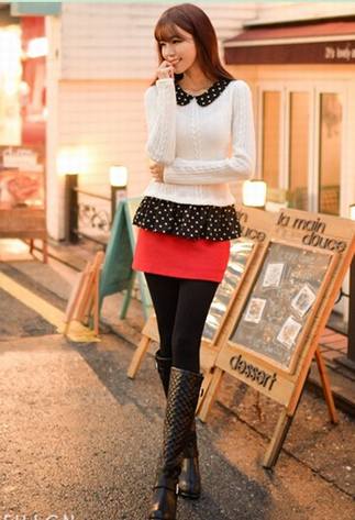 红色的针织衫毛衣采用娃娃领的设计搭配上印花的高腰短裙。这里采用的是经典的红黑搭配给人简约舒适休闲味甜美可爱的味道十足,腰部的高腰划出完美的身材。
