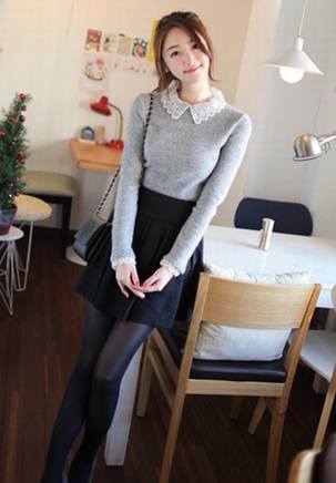 灰色的针织衫毛衣给人一种朴素低调的感觉搭配上高腰的黑色短裙,让姑娘在低调的同时又不失可爱优雅淑女的味道,这样的搭配还可以显高收腰的作用。