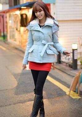 短款的棉衣采用淡蓝色的整天颜色而要把的蝴蝶结腰带让姑娘又淑女可爱的气质。而搭配上撞色的红色短裙和黑色打底裤让妹妹在冬季时尚又可爱。