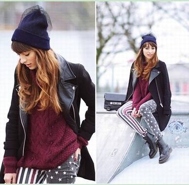 酒红色的毛衣本身就看上去暖和搭配上皮质大衣更加让身上不透风而下身选择是米国国旗的牛仔裤而且是塞到鞋子里面的,让整体的保暖又时尚,而这里还采用了帽子的点缀让整体看上去更加的时尚和漂亮。