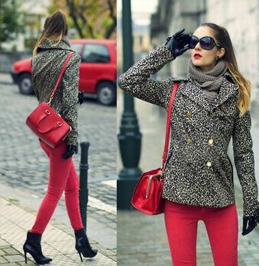 除了上面所讲的用不透风,大衣裹起来,围巾,鞋子。。。等等这些还可以用眼神来显时尚。上面模特就显示是红色的裤子,上身豹纹的外套和围巾,这样肯定是保暖又时尚。时尚不管什么季节都是可以的。