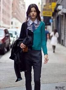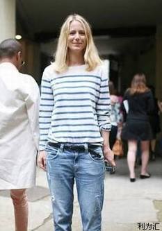 横条纹代表了年轻和活力,落拓的牛仔长裤搭配条纹羊绒衫,给人清爽干练,休闲随意的感觉,红色细高跟鞋中和了全身的中性气质,为整体造型加分。