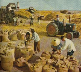 五河位于淮河下游,是浍河、沱河、和潼河的汇口处,河多湖多,地形低洼。从前的五河县是:“五河五道河,河多灾害多,有雨泛洪水,无雨禾着火,弃儿又卖女,乞讨度日月。”而现在的五河则是:五河五道河,河多幸福多,鸭鹅鱼满塘,稻麦闪金波,丰衣又足食,遍地幸福歌。”图为新集公社在庆丰收。(1960年)