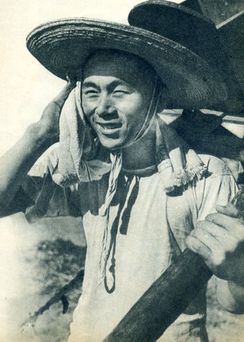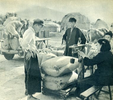 村里的火星农业生产合作社今年打了10万多斤小麦,比战前多了一倍。社员们正把一部分余粮卖给国家。
