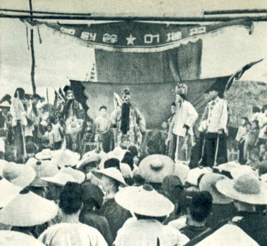 村里的农民业余剧团在演唱民间戏曲。