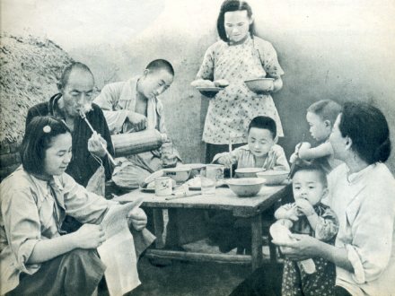 农民王立隆(左第二人),战后重建起自己的家园,家中人口也比以前多了一倍。