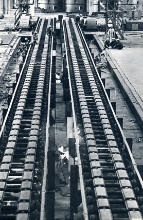 过去由于日本帝国主义和国民党反动政府严重破坏而停火8年的马鞍山铁厂6座炼铁炉,现已改建成功,全部出铁。图为一号炼铁炉的全景和二号炼铁炉的一部分。(1954年)