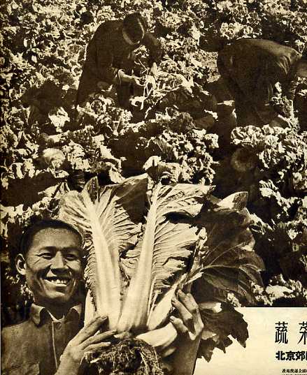 产地几遍全国的北京大白菜。这是1952年北京西郊彰化农场白菜田。工人们正在进行收割前的菜叶整理工作。