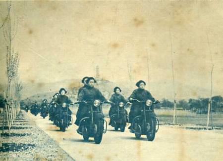 新中国第一批女摩托车运动员,驾驶着我国自制的“井冈山”号摩托车,在北京西郊公路上奔驰。
