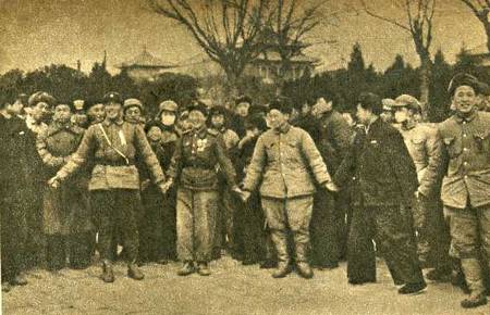 首都的工人、学生和中国人民志愿军归国代表团、朝鲜人民访华代表团的代表们于1月28日在北京中山公园举行春节联欢。这是志愿军归国代表们、朝鲜的人民军代表们与首都工人、学生正在一起愉快地跳集体舞。