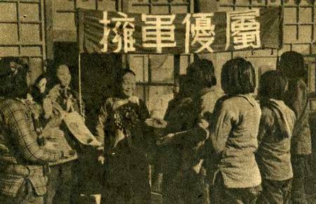 “大红花,大红花,光荣的母亲戴上它,儿子前方打美帝,我们慰问老妈妈。”北京市第一女子中学的学生在春节中组织的拥军优属慰问队在慰问军属陈烈老太太。