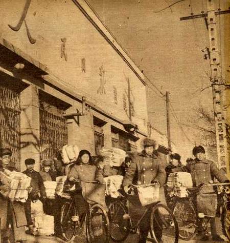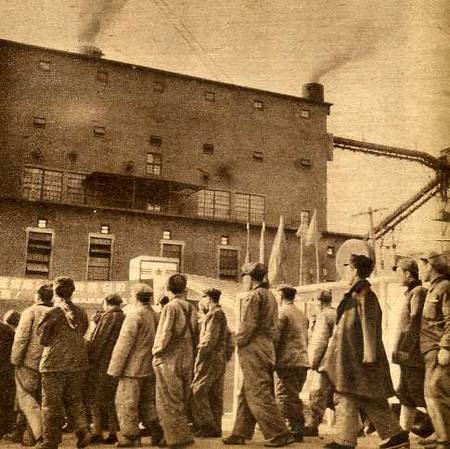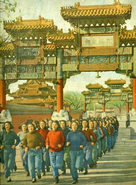 北京人民印刷厂的工人,从他们的宿舍走向工厂。