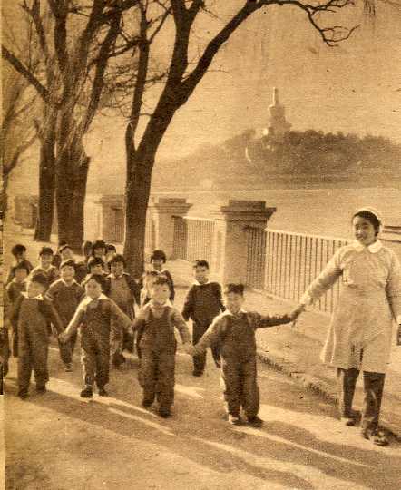 早晨,一个托儿所的孩子们,在北海公园里玩。