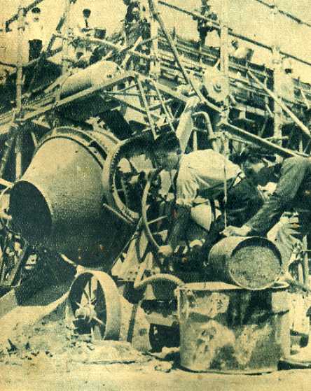 建筑工人在工地上使用中国制造的混凝土电动搅拌机。