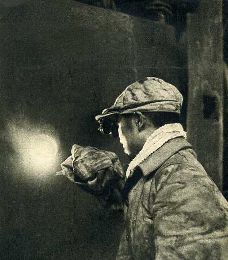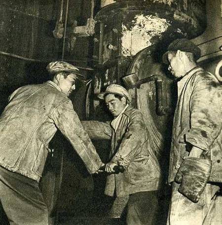 孙克诚与孟庆辉同学穿上了工作服,在炼铁厂工人(右)的帮助下进行生产实习。