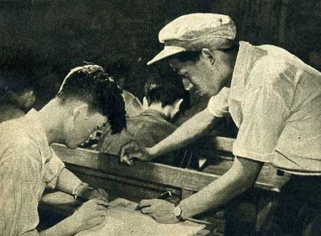 马新科同学(右)帮助轧钢厂的劳动模范苏清海(左)复习轧钢原理。