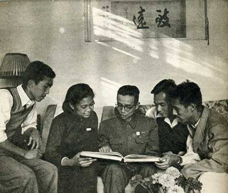 清华大学建筑系华侨学生,在系主任梁思成教授(中)家里,向他请教关于民族形式的建筑问题。