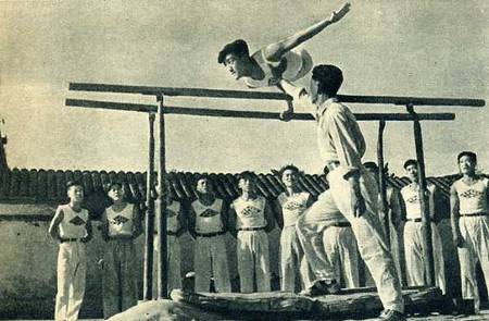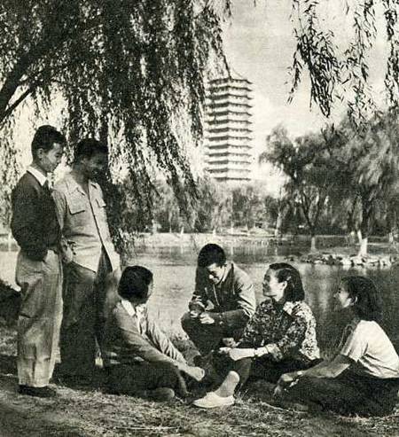 余暇时,同学们与创造小轧钢机成功的全国工业劳动模范张明山在公园里游玩。
