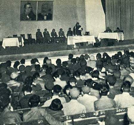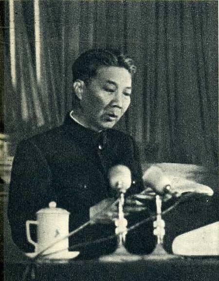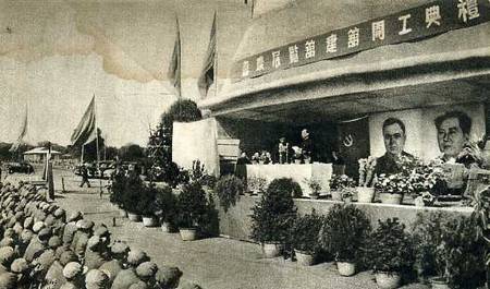 图为北京市人民政府市长彭真在苏联展览馆工程开工典礼上致词。