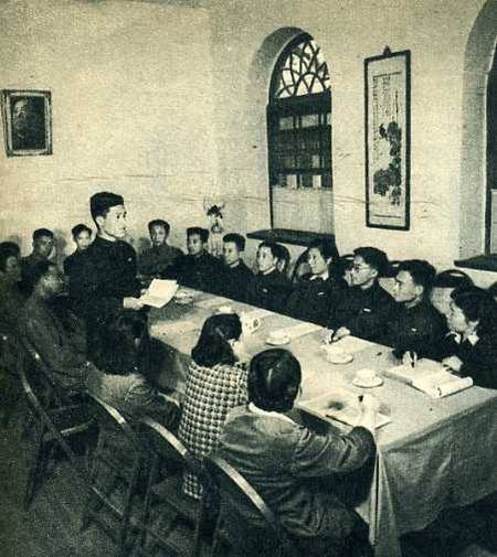 教师们在观摩教学后举行评议会,分析教学工作的优缺点,并由会议主持者、教导主任李中做总结发言。