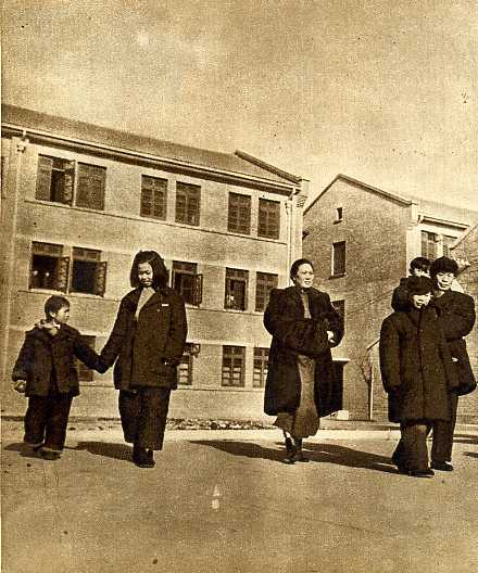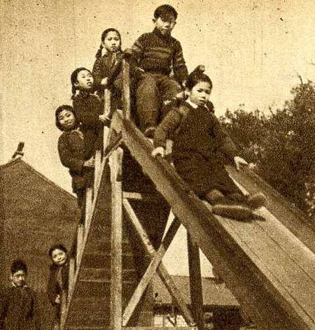 长子宝源和次女佩玉(滑梯上面两个孩子)都是工厂子弟小学校的学生,他们正在校园里游戏。