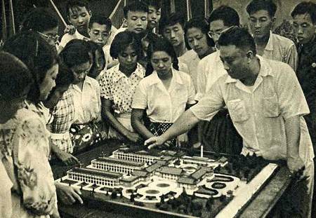 参加开工典礼的北京市青年学生们,参观疗养院的建筑模型。