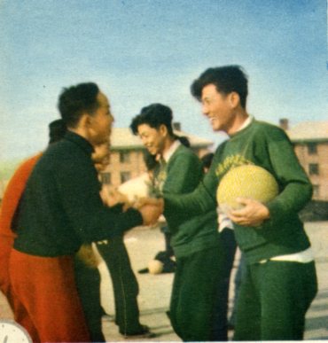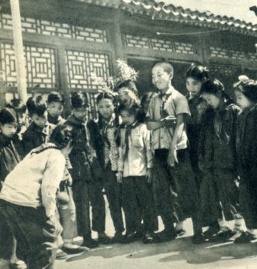 13岁的刘育间(右起第四人)父母都已去世,又无亲友照顾。他写信给市长要求帮助,政府让他在前门区正义小学免费读书,每月还补助他生活费用。这是他在学校里和同学们做游戏。