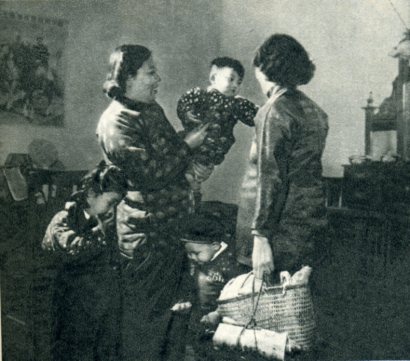 李老太太(右第一人)过去一直不看报,现在参加了居民委员会组织的读报组,时常和邻居们谈谈报上有趣的事情。
