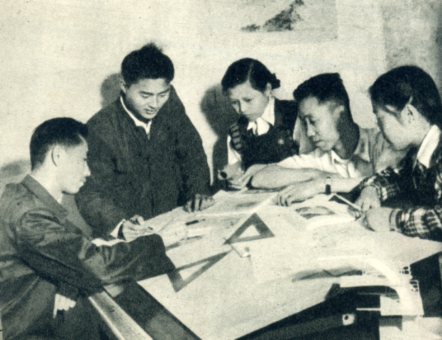 市里原有的游泳场只能容纳h2千多人,市人民委员会根据群众的反映,决定在先农坛和陶然亭之间再建一个游泳池。预计今年6月底就可完工。这是设计人员在审查游泳池的图样。