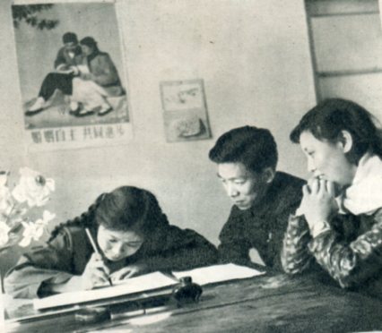 居民之间展开了扫除文盲的工作,居民委员会主任张延社利用晚间的空闲替大家选择材料。
