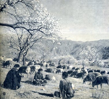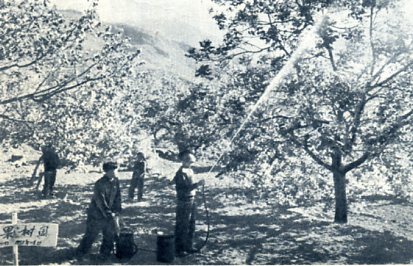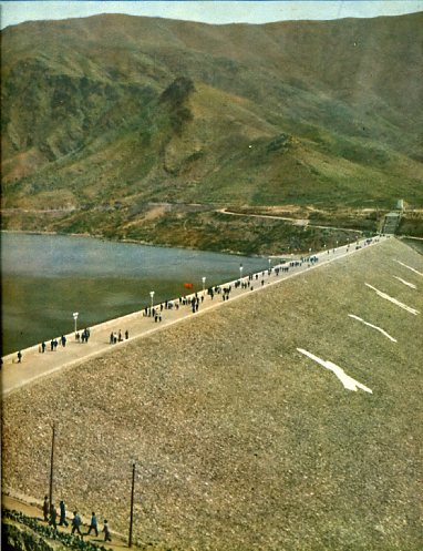 去年由北京人民义务劳动建成的十三陵水库,最近第一次开始放水灌溉农田。库内已养鱼30万尾。
