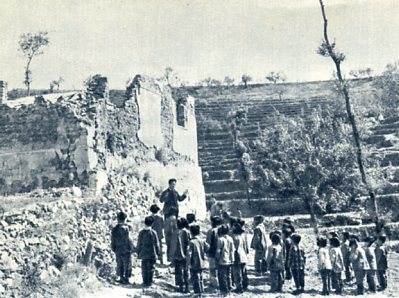 山上的小学教师韩区凤带着学生来看抗日战争时期被日军破坏的房子。