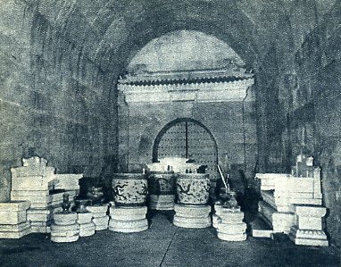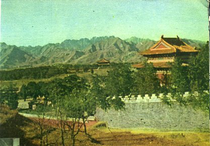 北京西北郊游览胜地十三陵,苍松翠柏,碧瓦红墙,地下有十三座规模巨大的坟墓,埋葬着明朝的十三个皇帝。定陵是万历皇帝朱翊钧(1573-1620)的墓。在他统治期间,外族入侵,民穷财尽,但他在22岁就开始用800万两银子和6年时间为自己修建了这座奢华的葬身之所。
