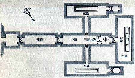 这座宫殿,埋藏在20多公尺深的地下,长80多公尺,全部是砖石结构,没有柱子。从外到里有三道大门通往后殿,另有两道门通向左右配殿。这些门是用整块的汉白玉雕出来的。中殿里摆着三张大理石雕龙宝座,座前供着香烛至今都还完好,大磁缸里长明灯油还剩着大半缸。后殿里放着朱翊钧和他的两个皇后的三具朱漆木棺。殉葬品都是他们生前在皇宫使用的金、银、玉器、瓷器、漆器等,此外还有许多整匹的织锦。这些珍贵的文物形象地揭示出封建帝皇的骄奢淫逸,但人们也可以从这里看出当时劳动人民辉煌的创造才能和技巧。这座地下宫殿为研究那时的历史提供了重要资料。
