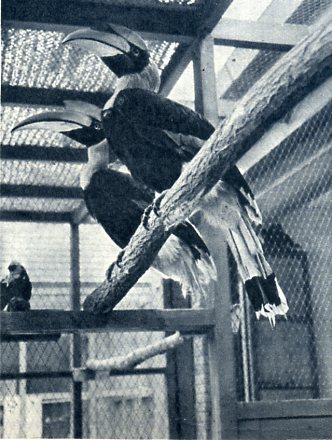 北京动物园展出的两只双角犀鸟,是不久以前才在云南省捕获的。这种羽毛美丽,嘴长约占身工的六分之一。它们非常重情,配偶中如有一只被杀害,另一只就绝食而死。每年1-4月,雌鸟在树洞中孵卵,雄鸟将洞口封闭,留一小孔,觅食喂养,直到小鸟出世。