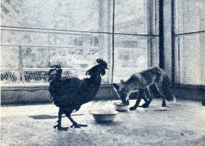 北京动物园里的这只狐和这只鸡已经和睦地在一起生活了4个月。开始时,公鸡傲慢地踱来踱去,小狐狸蜷卧一旁,谁也不理谁;过了一个月,彼此才逐渐亲近起来。
