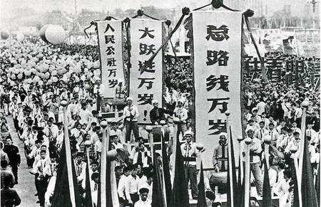 北京郊区农民高举“总路线万岁”、“大跃进万岁”、“人民公社万岁”的三面大旗,行进在共和国十年庆典的群众游行队伍中。
