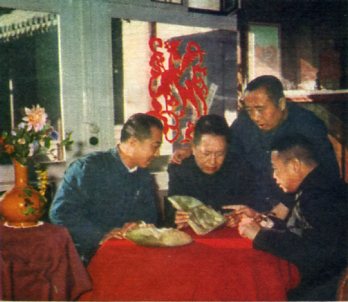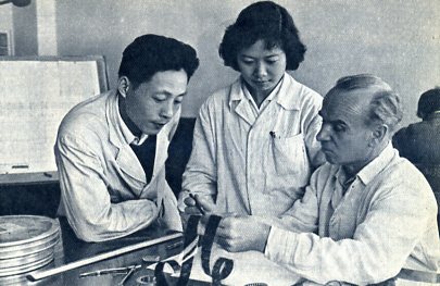 厂里的捷克斯洛伐克专家、布拉格电影洗印厂总工程师克连博士(右)同我国技师施祖德(左)和技术员谢荷蓉一起研究彩色影片的洗印问题。