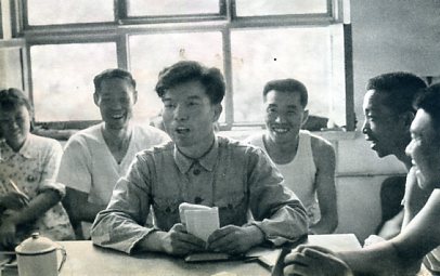 革命委员会委员、革命闯将陈运启同志在全厂民兵活学活用毛主席著作讲用会上,和同志们一起交谈学习毛主席著作的心得体会。