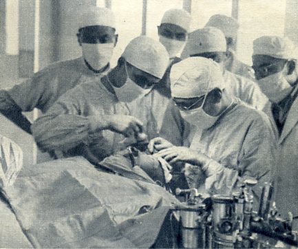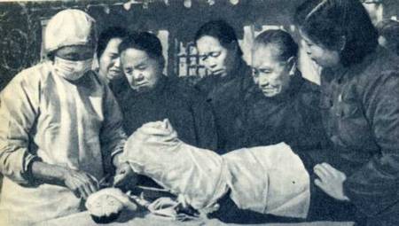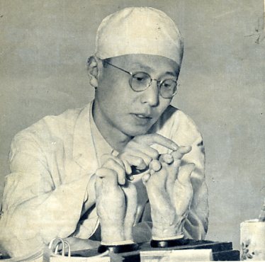 北京医学院成型外科专家朱洪荫教授在腊型上进行手术前的研究。