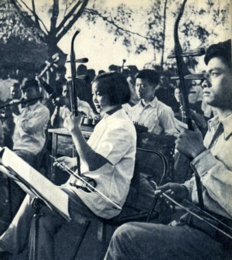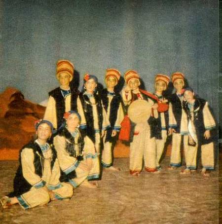学校里的文艺工作团演出的节目都是各民族自己的舞蹈、音乐和歌唱。这是彝族的安乐山舞。