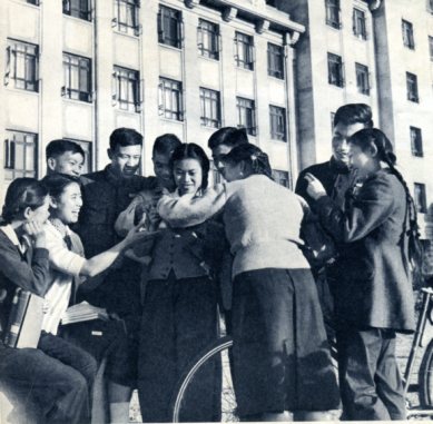 钢铁学院学生争着看《人民画报》记者替他们拍的照片。
