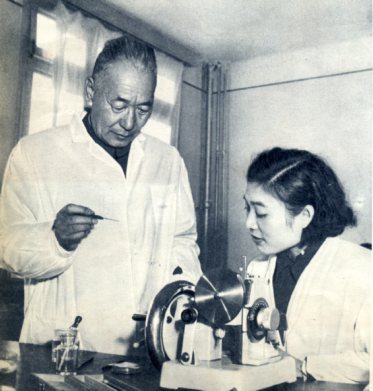 北京医学院教授、组织学家马文昭(左)正在看青年讲师吴景兰做的组织切片。