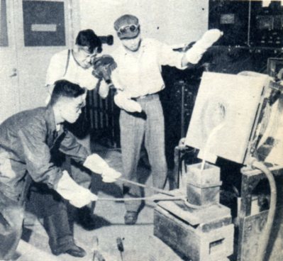 钢铁学院冶金系学生注视着从高频感应电炉里流出来的钢水。