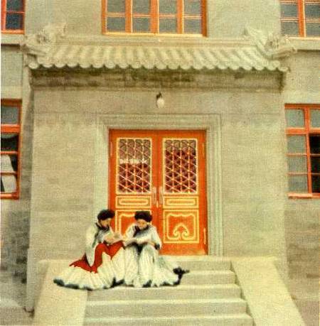 彝族女青年余龙和阿枝,是从西南民族学院调来学习的。这是她们利用课余时间在宿舍门前阅读政治书籍。