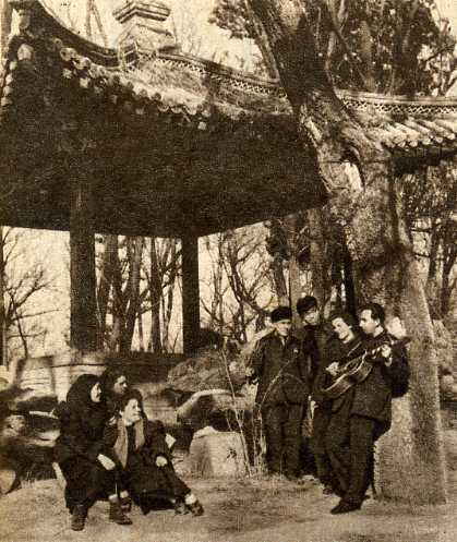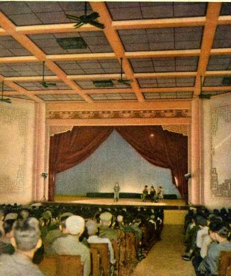 每当学习报告会或者是演出与联欢会开始之前,在这个美丽礼堂的前廊里,总是充满着谈笑和歌声。