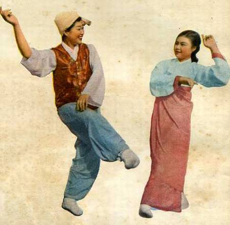 东北延边朝鲜族学员崔玉锦和李云淑在表演延边朝鲜舞。
